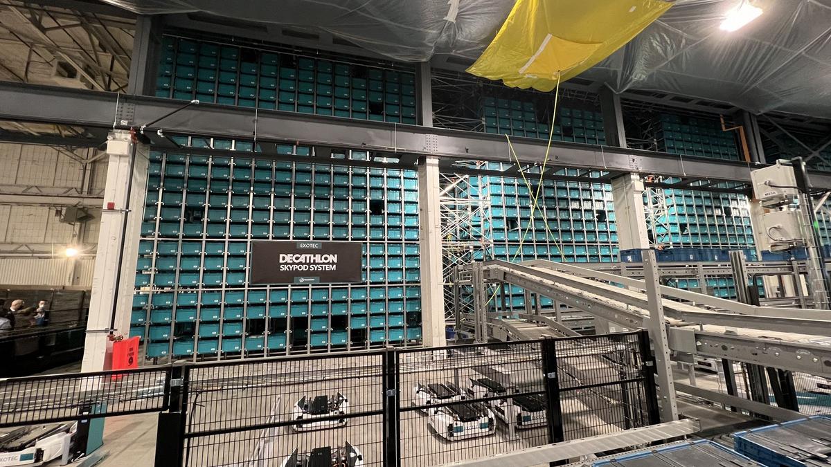 Le système Skypod, fait appel à des robots qui peuvent atteindre une hauteur de 12 mètres pour permettre un stockage à haute densité. Exotec multiplie par 6 la productivité de l’entrepôt avec des temps de réponse de 2 minutes pour toutes les références. Il permet à Décathlon de réduire les douleurs et incidents quant au travail logistique de ses employés.